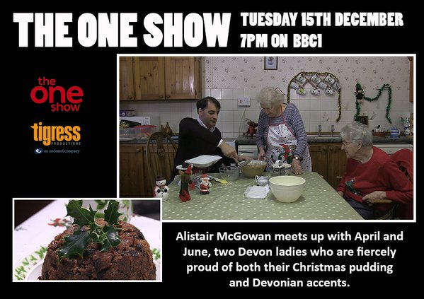 TONIGHT on #TheOneShow 7pm @BBCOne Alistair McGowan meets two Devon ladies who are fiercely proud of their Xmas pudding and Devonian accents
